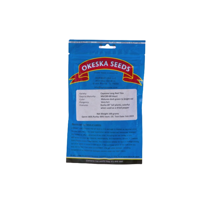 Cayenne Long Red Thin Days to maturity: (69 - 80 days ) Color: Matures dark green to bright red’ Pungency: Very hot Features: Bushy 26” tall plants, colorful when used as a dried pepper. Net weight: 100grams |