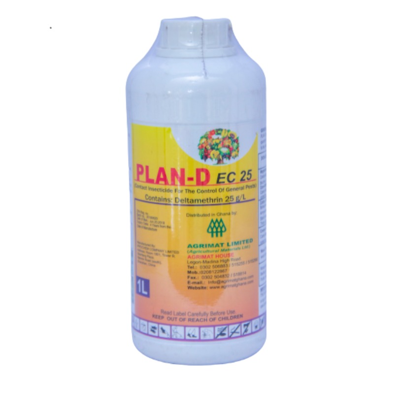 EC 25 acts by contact and ingestion. Dilute the appropriate quantity of Plan D with water and spray thoroughly the plants to be protected with any type of suitable sprayer. It controls caterpillars, cutworm, grasshoppers, Aphids, Thrips, Wood borers, Mosquitoes Ants, etc. Active Ingredient: Deltamethrin 25g/L |