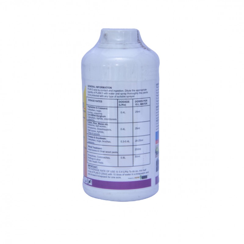 EC 25 acts by contact and ingestion. Dilute the appropriate quantity of Plan D with water and spray thoroughly the plants to be protected with any type of suitable sprayer. It controls caterpillars, cutworm, grasshoppers, Aphids, Thrips, Wood borers, Mosquitoes Ants, etc. Active Ingredient: Deltamethrin 25g/L |